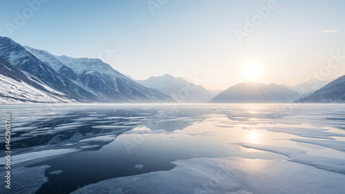 A serene frozen lake reflecting snowy mountains under soft winter sunlight.