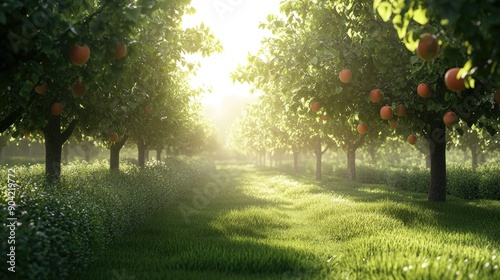 A serene fruit orchard with plum trees bearing ripe plums, surrounded by green grass and bathed in sunlight.