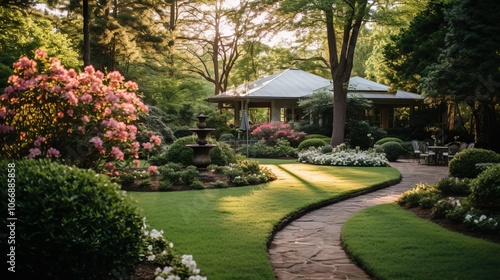 A serene garden oasis with blooming flowers and a charming gazebo during golden hour