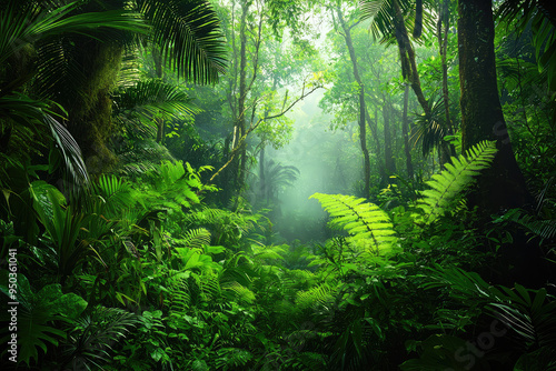 A Serene Glimpse into a Lush Rainforest Awash with Mist, Illuminated by Soft Light - Nature's Tranquility Unveiled