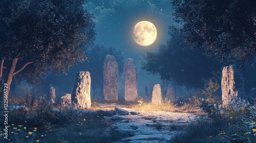 A serene grove with an ancient stone circle, glowing softly under moonlight, a place of magic and ancient rituals