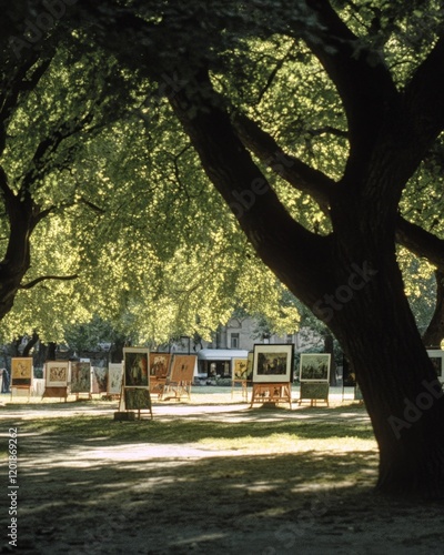A serene image of a quiet art festival in a park, with paintings displayed under shaded trees