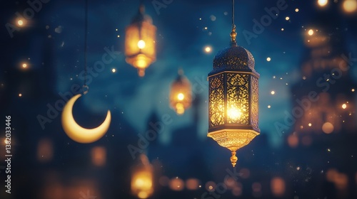 A serene image of golden lanterns glowing softly in the night sky, with crescent moons and stars decorating the peaceful Ramadan evening.