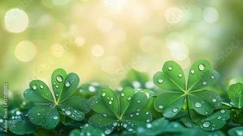 A serene image of lush green clovers with dew in soft morning light. Ideal for themes of nature, luck, and freshness, perfect for spring events or wellness designs.
