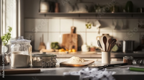 A serene kitchen counter bathed in warm sunlight, featuring an assortment of utensils, a cutting board with a mound of flour, jars, and kitchen tools.