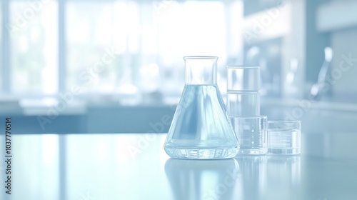 A serene laboratory scene featuring glassware with blue liquid, emphasizing a clean and modern scientific environment.