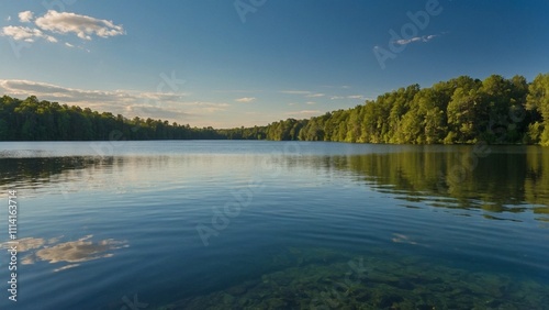 A serene lake glistening under the warm rays of the sun, surrounded by lush greenery and a clear blue sky.
