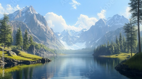 A serene lake surrounded by towering mountains under a clear blue sky.