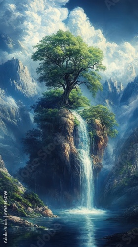 A serene landscape featuring a majestic waterfall cascading from a rocky cliff, surrounded by vibrant trees and clouds.