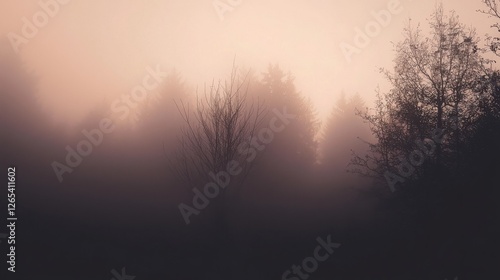 A serene landscape featuring a misty forest at dawn, with tall trees partially obscured in fog. The atmosphere is tranquil and ethereal.