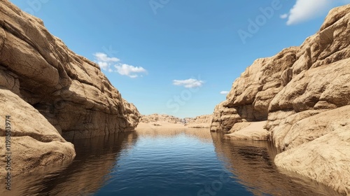 A serene landscape featuring a narrow canyon with calm water reflecting the blue sky and rocky cliffs under a few fluffy clouds.