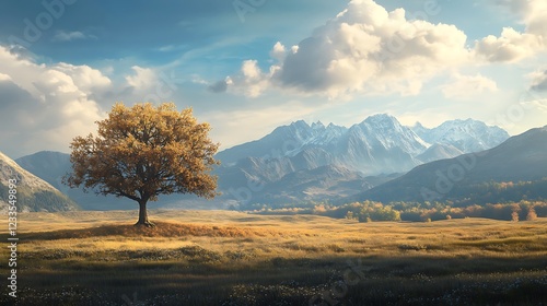 A serene landscape featuring a solitary tree against majestic mountains and a vibrant sky.