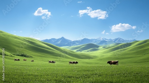 A serene landscape featuring brown and white cows grazing on vibrant green grass under a bright blue sky.