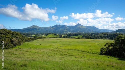 A serene landscape featuring lush green fields, distant mountains, and a bright blue sky with fluffy clouds.