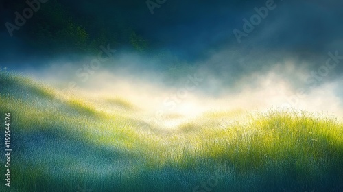 A serene landscape featuring rolling hills illuminated by soft light, creating a tranquil atmosphere with a blend of blues and greens.