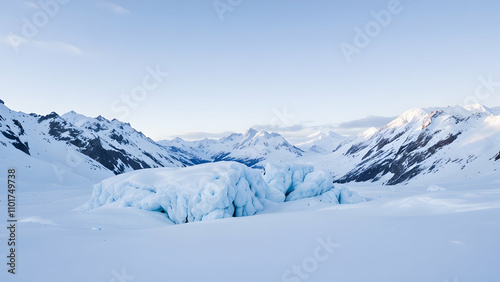 A serene landscape showcasing a glacial formation amidst snowcovered mountains under a clear, pale blue sky. The ice displays a striking blue hue.