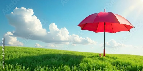 A serene landscape with a large, protective umbrella symbolizing comprehensive coverage and financial security, ideal for illustrating umbrella insurance concepts , serenity, responsible planning