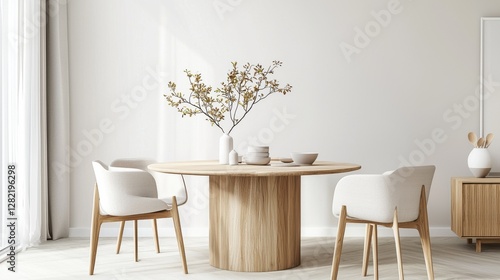 A serene minimalist dining room with a round or oval wooden table, soft pastel color palette, modern Scandinavian chairs, elegant interior design