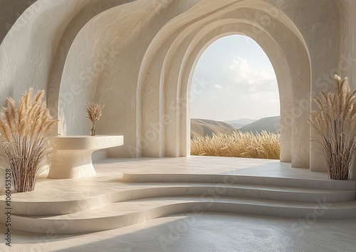 A serene, minimalist interior with arched architecture and a scenic view of nature.