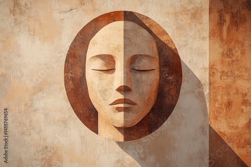 A serene, minimalist relief of a human face with closed eyes, set in a circle, against a textured wall in warm, earthy tones.