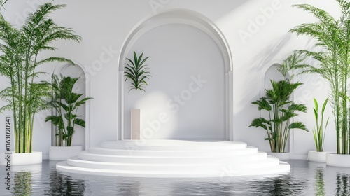 A serene, minimalist stage with steps, plants, and arched features, perfect for presentations.