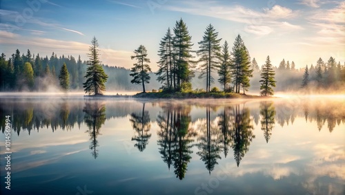 A serene, misty morning on a tranquil lake, with a small island, shrouded in fog, adorned with a cluster of tall, majestic trees, their reflections mirrored perfectly on the still water.
