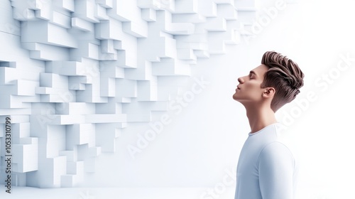 A serene moment of reflection amidst abstract white structures enhances emotional connection and personal growth