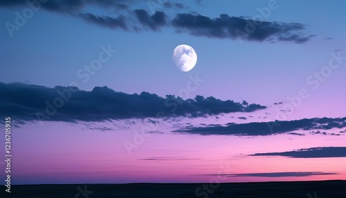 A serene moon rises over a tranquil landscape under a softly colored evening sky