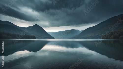 A serene mountain lake landscape with dark, cloudy sky and calm water reflecting the surrounding mountains and trees.