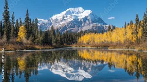 A serene mountain landscape reflecting in a calm lake, surrounded by autumn foliage and clear blue skies.
