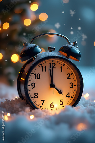 A serene new year countdown scene features a ticking time clock amidst gentle snowflakes softly falling in the background._00002_