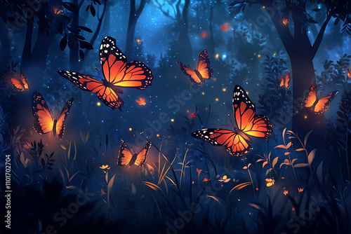 A serene night scene featuring glowing butterflies in a mystical forest.