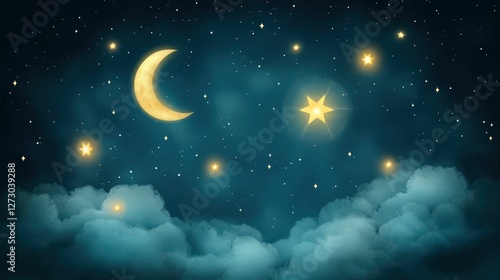 A serene night sky features a crescent moon, twinkling stars, and soft clouds, creating a tranquil and dreamlike atmosphere.
