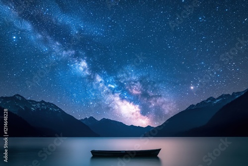 A serene night sky filled with stars above a tranquil lake, surrounded by majestic mountains, creating a peaceful and captivating atmosphere.