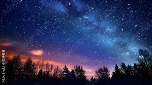 A serene night sky with stars and a silhouette of a forest in the foreground.