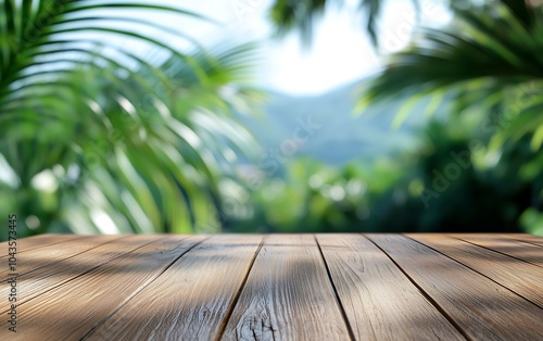 A serene outdoor scene featuring a wooden tabletop in focus, with lush green palm leaves and distant hills blurred in the background.