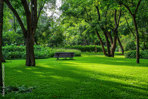 A Serene Park Lawn With Lush Greenery and a Quiet Bench Under the Shade of Tall Trees