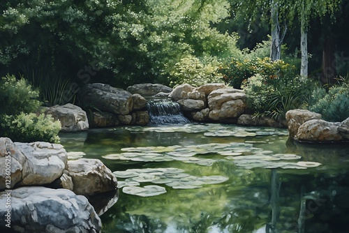 A serene pond scene with rocks, water lilies, and lush greenery.