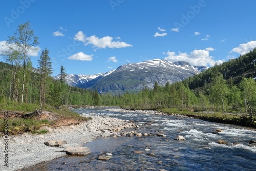A serene river flowing through a mountainous landscape under a clear blue sky