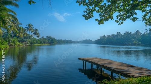 A serene riverbank with a wooden fishing dock, surrounded by lush greenery, under a clear blue sky, and gentle ripples on the water.