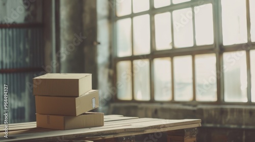 A serene, rustic warehouse, bathed in soft natural light, houses a stack of cardboard boxes on a wooden workspace, evoking a sense of quiet productivity.