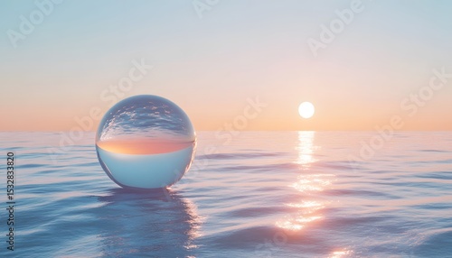 A serene scene of a glass sphere resting on tranquil water, reflecting a beautiful sunset.