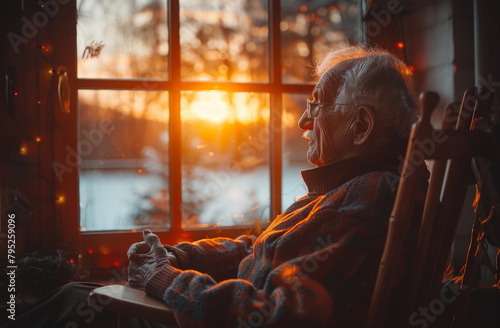 A serene scene of a man contemplating quietly as he gazes out the window on a sunset