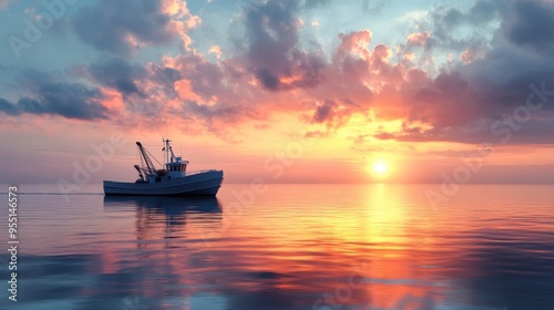 A serene scene of a small fishing boat returning to harbor at sunset, with the warm glow of the sun reflecting off the calm water.