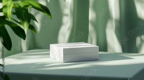 A serene scene of a white gift box placed on a fabric-covered table, with gentle sunlight filtering through foliage, creating dappled shadows that enhance the natural and tranquil vibe.