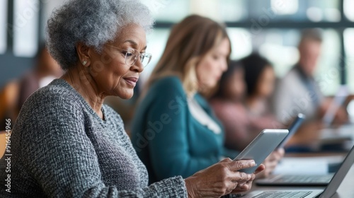 A serene scene of an adult learning class where middle-aged and senior participants are intently focused on their tablets and laptops, guided by an instructor who is patiently explaining a concept,