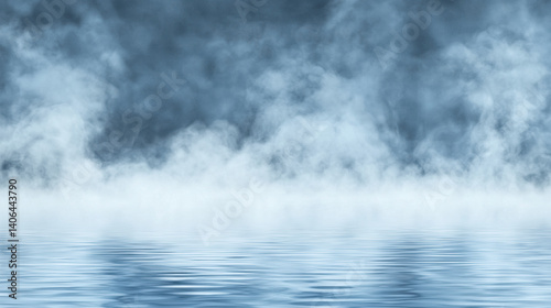 A serene scene of mist rising above calm water, creating a tranquil, ethereal atmosphere with soft blue hues.