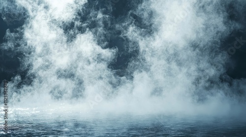 A serene scene of mist rising over water, creating an ethereal atmosphere with soft, diffused light and a moody ambiance.
