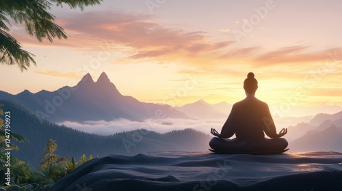A serene silhouette meditates on a rock, surrounded by majestic mountains and a vibrant sunset casting a peaceful ambiance.