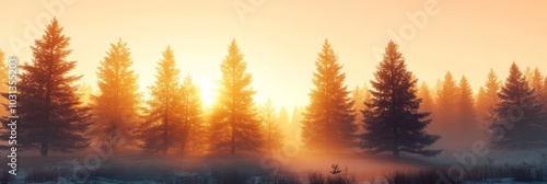 A serene sunrise over a misty forest, with tall evergreen trees silhouetted against warm hues of orange and yellow.